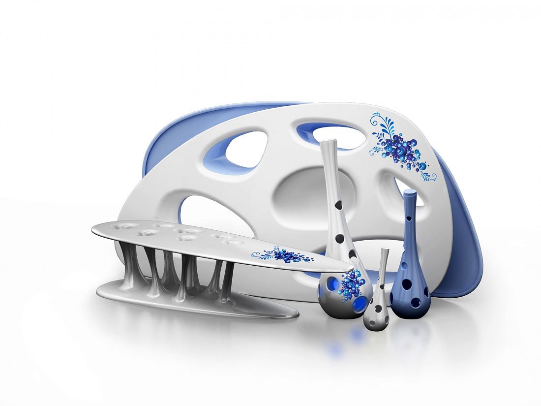 O-Zone представляет собой систему зонирования пространства, как общественных помещений, так и частного интерьера. Коллекция состоит из трех видов объектов: перегородки с нишами для хранения, обеспеченной автономной системой озонирования, скамейки, а также набора вазонов. Стилевое оформление объектов заимствовано у древней русской ремесленной культуры, в основе которой лежат бионические мотивы, применявшиеся для создания детских игрушек и посуды на Руси. Характерный узор нанесен на поверхность DuPont™ Corian® с помощью специальной технологии сублимации, при которой перенос изображения осуществляется с помощью сублимацимонной бумаги: чернила под действием температуры и давления переходят на поверхность материала и закрепляются внутри поверхности. Все элементы коллекции выполнены из DuPont™ Corian® (цвета Glacier White и Diamond Blue.) Таким образом, O-Zone похожа на своего рода чайный сервиз из гжели.