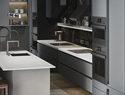 Композиция в центре кухни навеяна образом золота как символа ценности, силы и внутреннего ресурса. Но здесь нет показной роскоши — только чистая форма, белый фон и элементы, которые выстроенны в гармоничную структуру.
