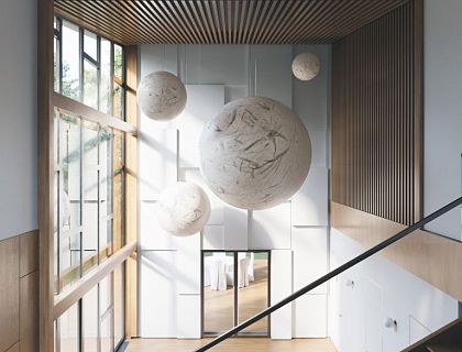 Авторы: Екатерина Каретина, Александр Мельниченко. Создана атмосфера уюта, сочетающаяся с классической строгостью в современном прочтении, перетекающие пространства, отсутствие лишних перегородок и дверей. Светильники, мебель, потолочные ниши - выполнены в бионической стилистике с плавными закругленными углами. Вкрапления латунных элементов освещения и декора "под золото" - создают композиционные акценты.