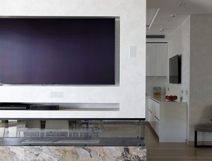 Подвесная итальянская кухня Bizotto Infinity с мягкой подсветкой и параллельной планировкой. Фасады в перламутровом сверхглянце наполняют пространство светом и изяществом. Столешница из кварцевого агломерата, техника Gaggenau и аксессуары Blanco создают гармонию красоты и функциональности.