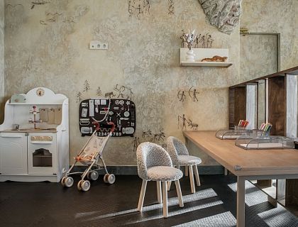 Винтажный шарм стал основой дизайна. Советские кресла, ковры с рисунком в духе домашней коллекции Gucci, живые растения — всё это создаёт особую атмосферу уюта и стиля. Акцентными деталями стали стены, расписанные в технике Color Block в фиолетовых, розовых и жёлтых тонах. На стенах представлены картины современных российских художников. Эти произведения не просто украшают пространство — они стали основой для будущих аукционов, которые проводятся в этих стенах.