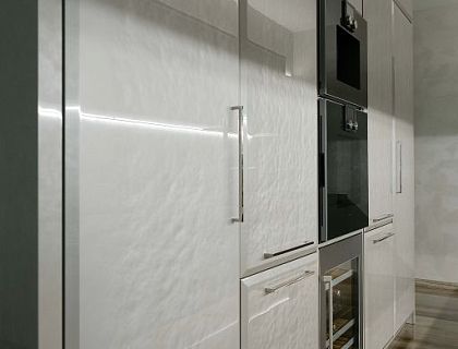 Сердцем интерьера стал камин с трёхсторонней панорамой огня. Его лёгкая, почти парящая форма и мраморная отделка создают динамику и элегантность, а прозрачность конструкции объединяет кухню и гостиную в единое светлое пространство. Это не только архитектурный акцент, но и символ тепла для семьи.