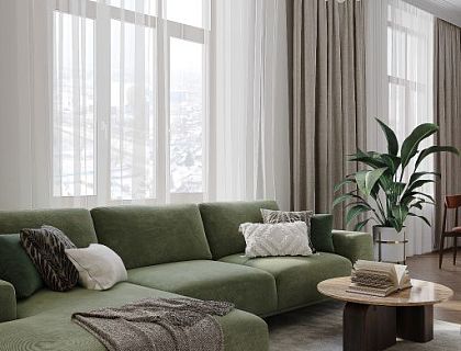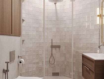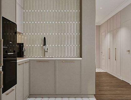 Дизайн квартиры в стиле современной классики на 60 м² объединяет уют и функциональность. Бежевые оттенки визуально расширяют пространство, создавая гармоничную атмосферу. Ассиметричная планировка включает светлую кухню-гостиную с удобной зоной отдыха и обеденным столом. В спальне — элегантность с цветочными обоями и функциональной мебелью. Ванная оборудована душевой и скрытой прачечной, что обеспечивает комфорт и порядок.