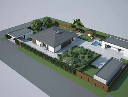 Большой участок с лесными деревьями имеет хорошие пропорции. Очень неудачно расположен дом и прилегающие постройки - делят участок на две равные половины. Заказчик на данный момент располагает ограниченными средствами, поэтому пока речь идет только о проекте ландшафтного дизайна.