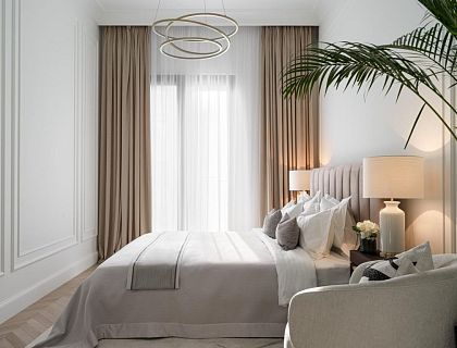 Маленький и функциональный. Клиент пришёл с недоделанным проектом — мы согласовали отделку, мебель, освещение и декор, перепроектировали шкафы, переделали кухню, добавили текстиль, картины, декоративные стенки и авторскую керамику. Работа велась на стадии финальной отделки, интерьер создавался в готовом пространстве с вниманием к деталям. Использовали дубовые полы, лепнину, нежные ткани, стекло и мрамор; акцент на обтекаемых формах, мягких коврах и натуральных оттенках.
