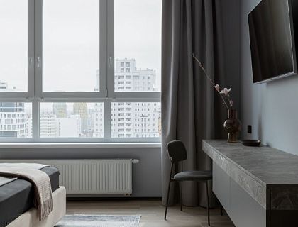 Клиенты покупали этот дом с готовой отделкой, перед началом проектирования напольные покрытия, двери, керамогранит в санузлах должны были быть сохранены. В итоге к этой базовой отделке мы добавили нейтральные оттенки фона и яркие акценты. Зону лестницы выделили неубиваемыми панелями из полиуретана в сочетании с керамогранитом. Вся общая зона — проходной коридор, кухня и гостиная выполнены в одних материалах — что делает пространство едиными стилистически и в то же время уютным.