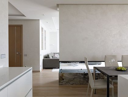 Подвесная итальянская кухня Bizotto Infinity с мягкой подсветкой и параллельной планировкой. Фасады в перламутровом сверхглянце наполняют пространство светом и изяществом. Столешница из кварцевого агломерата, техника Gaggenau и аксессуары Blanco создают гармонию красоты и функциональности.