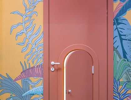 Треугольная планировка дома для молодой семьи из четырех человек в их недавно построенном доме, две детские комнаты, современная мебель, 95 м2. Стеклянная стена в ванной комнате с вязаным узором, натуральные материалы, креативное освещение. Проект был опубликован в Венгрии на портале о декоре и дизайне Lakbermagazin.hu