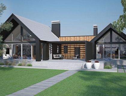 Естественная красота не многословна. Натуральные местные материалы, окружающая природа Воронежского края, все это создало гармонию и выразительность проекту. На холмистом ландшафте, выделяется своей торжественностью и величием, коттедж из бревен, украшенный чёрными коваными перилами с завитками.