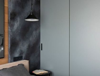Организацию этого пространства диктовали особенности помещения: два небольших отдельных зала, соединенные коридором. В одном сделали открытую кухню совмещенную с гостиной, в другом - приватную зону спальни.
