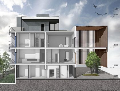 Здание состоит из двух объемов разной этажности. Входная группа, спальни и вспомогательные помещения размещены в двухэтажной части, которая состоит из объемов с скатной и плоской кровлей. Вход выделен консолью. Одноэтажный объем - гостиная, кухня, столовая и крытая уличная кухня в максимальной высотой потолка 4.5 метра. Общая площадь дома 280м2. В доме расположены 3 спальни, 3 ванных комнаты кабинет, гостевой санузел и кладовки около каждой функциональной зоны.