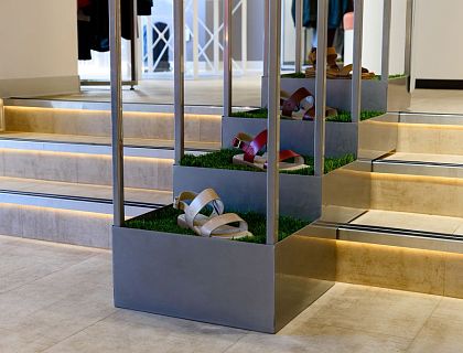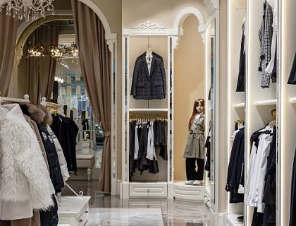 Бутик детской одежды находится в ТЦ Лето, в СПБ. Вся мебель и оборудование для бутика выполнена на заказ по индивидуальным эскизам. Кассовая зона в центре зала и выполнена трехсторонней, в  виде овала со стеклянными дверьми. В зале есть камин и зона ожидания.