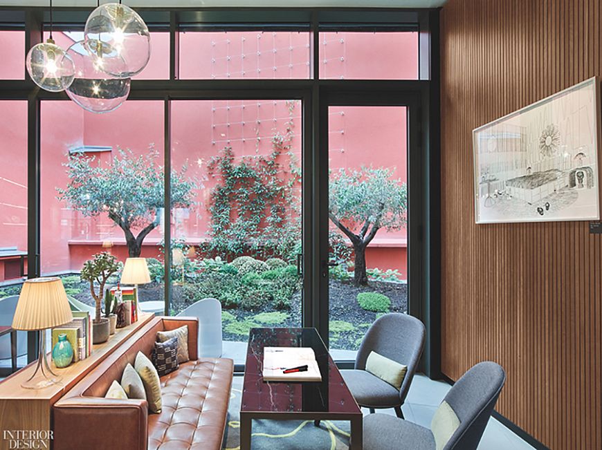 В комнатах отеля по контрасту с холлами – спокойная атмосфера. Здесь использовано много дерева, например, тонированные дубовые панели. Изголовья кроватей обтянуты тканями с авторскими принтами. Общественных пространств в интерьере не очень много. В подвале запроектирована галерея Drawing Lab, на крыше – терраса со столиками и зонтиками. Украшением внутреннего пространства отеля можно назвать коктейль-лаунж на первом этаже. Красные стены этого помещения – отсылка к творчеству Луиса Баррагана. Лаунж обставлен мебелью Филиппа Нигро и Neri & Hu. «Главное, чего мы боялись, - излишняя декоративность. К счастью, перегруза удалось избежать», - вспоминают архитекторы.