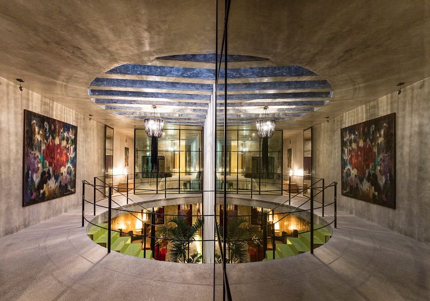 Основным материалом проекта стал полированный бетон. В качестве контрастного материала было выбрано полированное стекло. Из него сделаны перегородки приватным помещений. Таким образом архитекторы достигли двух целей. Во-первых, обеспечили неприкосновенность частной жизни в довольно открытом доме. Во-вторых, обеспечили «солнечный» декор интерьера, наполненного причудливыми отражениями и мерцающими бликами. Не случайно мексиканский проект называется «Калейдоскоп».