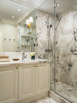 Интерьер оформлен в неоклассическом стиле, вне модных тенденций. Чёткие пропорции, качественные материалы и мягкая цветовая гамма создают атмосферу благородной сдержанности.