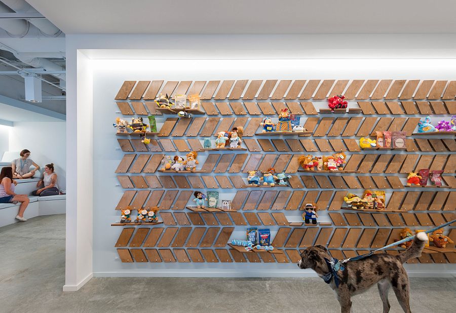 Общая площадь офиса, отделанного прочными и долговечными материалами, составляет чуть больше 2000 кв.м. Здесь есть много зон для работы, социализации, игры, а вот привычных стационарных столов нет. Вместо них дизайнеры установили передвижные «рабочие станции» со встроенными местами для животных. На входе сооружена система хранения по авторским чертежам, установлен дисплей для демонстрации зоотоваров.