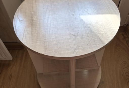 Столик кофейный б/у, на колёсиках, диаметр 40см, высота 52см, цвет дуб сонома, ДСП.В одном месте немного отходит край.Может использоваться как подставка для цветов Столик кофейный б/у, на колёсиках, диаметр 40см, высота 52см, цвет дуб сонома, ДСП.В одном месте немного отходит край.Может использоваться как подставка для цветов