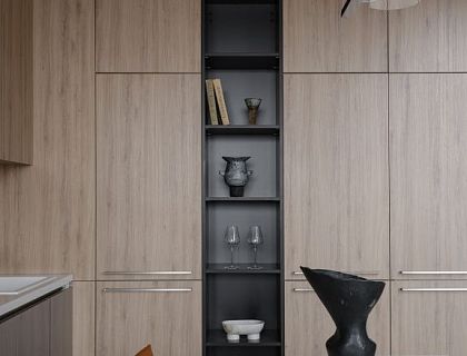 Композиция в центре кухни навеяна образом золота как символа ценности, силы и внутреннего ресурса. Но здесь нет показной роскоши — только чистая форма, белый фон и элементы, которые выстроенны в гармоничную структуру.