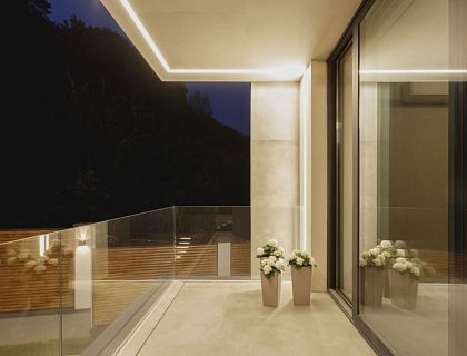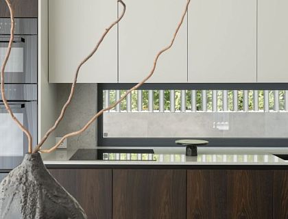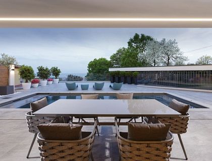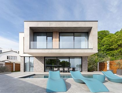 На данном примере можно наглядно убедиться, что 220 метров общей площади дома на 4,7 сотках земли может хватить на комфортное проживание семьи из 5 человек. Дом состоит из 2 этажей и чердачного полуэтажа. Террасирование участка позволило зонировать участок в 2 уровня. Нижний уровень служит парковкой, входной группой и зоной благоустройства. Верхний уровень полностью предоставлен приватной видовой зоной отдыха.