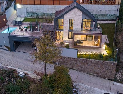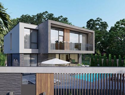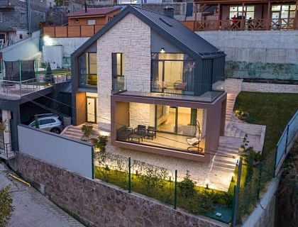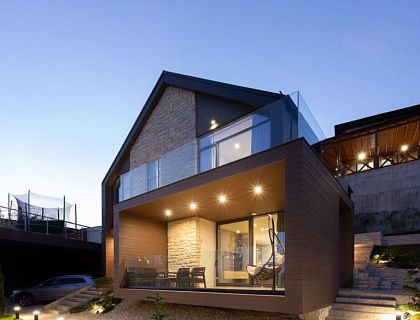 Наши заказчики родом из Санкт-Петербурга и пожелали как можно больше уличного света. Именно поэтому южный фасад с приватным панорамным видом на наиболее светлую южную сторону.  Пластичные формы фасада в комбинации с натуральным травертином, натуральной крупноволновой черепицы и субтропическим ландшафтным дизайном создают природную эстетику и гармонию на участке.