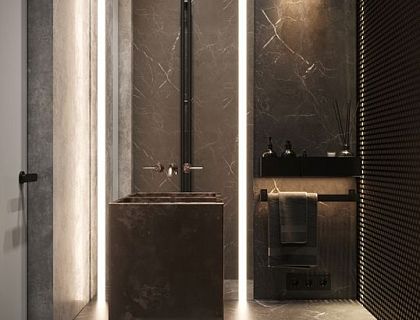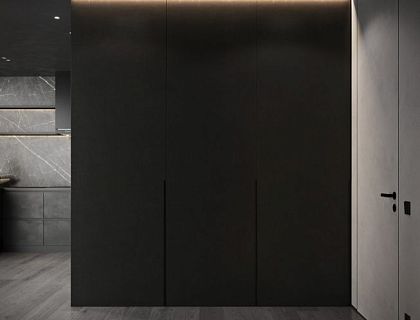 Дом для молодой семьи с двумя детьми. Семейные спальни на втором этаже имеют выход на большую открытую террасу с видом на участок. Для родителей предусмотрена гостевая спальня на первом этаже. В доме есть всё для комфортной жизни: сауна с душевой, отдельная постирочная, котельная, объединённая кухня-гостиная с камином. Фундамент — монолитная плита 250 мм с дренажом, каркасные стены с минераловатным утеплителем, плоская кровля, отделка — вертикальный брусок 40×40 мм.