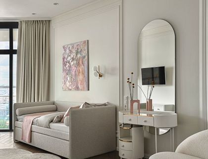Дизайн и реализация четырехэтажного пентхауса в Москве площадью 600 м2 стали вызовом для нашей команды. Задача — создать эстетичное и функциональное пространство. Два нижних уровня отданы детям с автономными зонами. Третий этаж — гостевой, для друзей и семейных мероприятий. Четвертый объединяет общие пространства: гостиную с потолками 4 м, кухню и мастер-спальню хозяев.