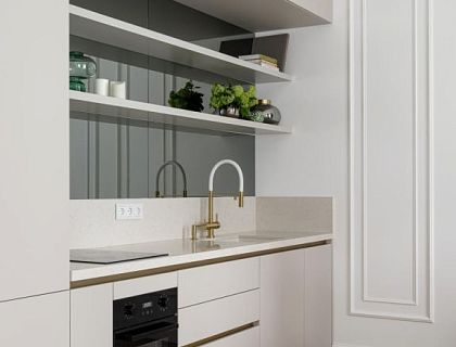 Небольшая квартира для молодой женщины выполнена с элементами традиционного стиля и именно они делают интерьер долгоиграющим. В нем всегда можно сделать легкий апгрейд, не трогая основу. В этом проекте за классику отвечают высокие плинтусы, гипсовая лепнина, дубовый паркет елочкой и высокие двери с филенками, сделанные по нашим эскизам.