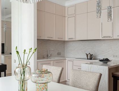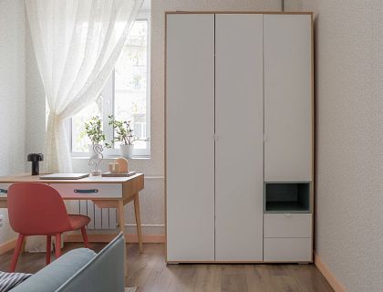 Клиенты покупали этот дом с готовой отделкой, перед началом проектирования напольные покрытия, двери, керамогранит в санузлах должны были быть сохранены. В итоге к этой базовой отделке мы добавили нейтральные оттенки фона и яркие акценты. Зону лестницы выделили неубиваемыми панелями из полиуретана в сочетании с керамогранитом. Вся общая зона — проходной коридор, кухня и гостиная выполнены в одних материалах — что делает пространство едиными стилистически и в то же время уютным.