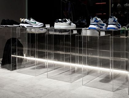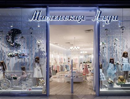 Флагманский магазин сети *Маленькая Леди* открылся в центре Санкт-Петербурга в *ТЦ Галерея*. Изначально помещение, которое было предназначено для магазина совершенно не выглядело многообещающим: узкое , с большим количеством технических выступов.  Но, пришла идея сделать галерею в *Галерее*, которая всем пришлась по душе. В эту концепцию легко легли арки с подсветкой, и технические особенности минусов превратились в плюсы.