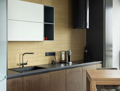 Основной идеей интерьера было сохранение пространства главного помещения с большими окнами и выходом на террасу, с которой открывается вид на Волгу. Зонирование гостиной строится вокруг многофункционального «куба», в которого размещены дровяной камин, экран проектора, хранение вещей и два санузла. Интерьер выполнен в минималистской эстетике: нейтральный фон (белые стены, деревянный пол теплого оттенка) с цветовыми акцентами по помещениям и акцентами на предметы искусства.