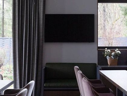 Вилла в Малом Сареево выполнена в минималистичном стиле. Её экстерьер характеризуется чистыми горизонталями и вертикальными ламелями, контрастирующими с витражами второго этажа. Фасады выполнены в матовых графитовых и бежево-серых тонах с тёплыми деревянными вставками, создающими динамику светотени. Архитектура виллы сочетает лаконичность форм, ясность структуры и взаимодействие объёма, света и фактуры материалов, подчёркивая современный минимализм.
