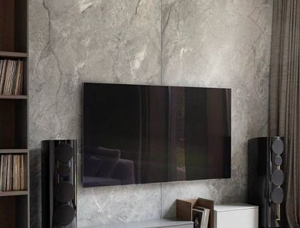 Главной задачей проекта стало создание визуальной и эмоциональной связи между домом и живописным лесным участком на берегу реки. В интерьере используются отделки из теплых природных материалов. А для оживления пространства и отсылки к лесной зелени использован насыщенный зеленый цвет в текстиле мебели. В проекте использован керамогранит итальянских фабрик Casalgrande Padana Cemento и Ergon by Emil Group Stone Talk.