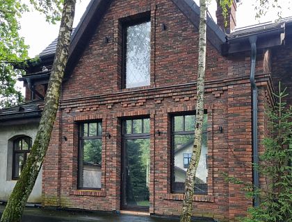 Двухэтажный кирпичный дом в классическом стиле с отделкой из облицовочного кирпича. Расположен на большом участке в Куровском Московской области.