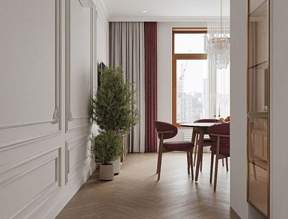 Дизайн светлой квартиры в зеленых тонах. Длинная угловая кухня. Уникальный стиль проекта и планировка: длинная Г-образная кухня, раковина в комнате, классическая спальня с зеркалом и детской комнатой. Парящая подсветка, зеркала и сочетание нескольких оттенков зеленого в необычном дизайне квартиры в ЖК  Галактика ПРО. Разработка и реализация проекта — Katushhha Studio.