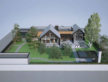 Компактный коттедж, расположен на сложном рельефе, в цокольном этаже гараж и мастерская, первый и мансардный этажи жилые.