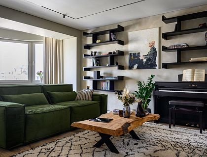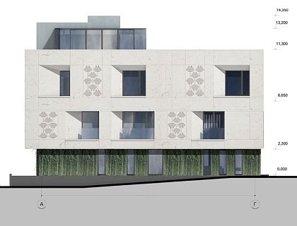 Здание состоит из двух объемов разной этажности. Входная группа, спальни и вспомогательные помещения размещены в двухэтажной части, которая состоит из объемов с скатной и плоской кровлей. Вход выделен консолью. Одноэтажный объем - гостиная, кухня, столовая и крытая уличная кухня в максимальной высотой потолка 4.5 метра. Общая площадь дома 280м2. В доме расположены 3 спальни, 3 ванных комнаты кабинет, гостевой санузел и кладовки около каждой функциональной зоны.