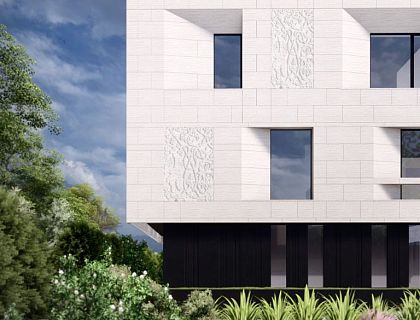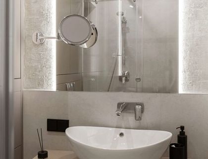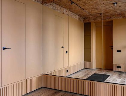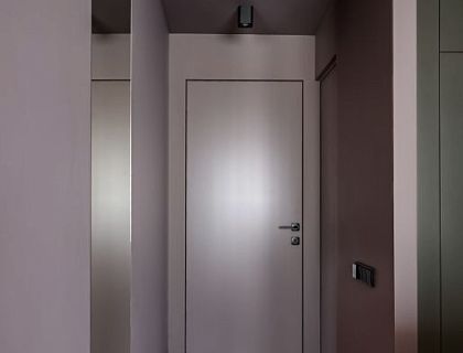 Классика в сочетание с современными решениями. Для оформления стен использовано до трех оттенков одного цвета, что  усиливает эффект архитектурных зеркал. Почти весь свет современный. Шкафы, сливающиеся с плоскостью стен, делают интерьер цельным и единым. В коридоре, около гостевого санузла, шкаф с фасадами повторяющими декор и цвет стен, в результате чего он стал практически незаметным. В прихожей поставлен встроенный шкаф с зеркальными, что визуально увеличивает пространство.