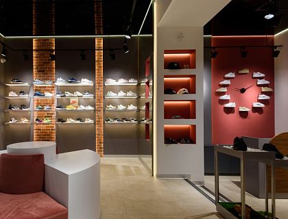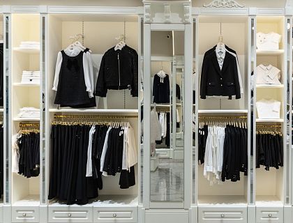 Бутик детской одежды находится в ТЦ Лето, в СПБ. Вся мебель и оборудование для бутика выполнена на заказ по индивидуальным эскизам. Кассовая зона в центре зала и выполнена трехсторонней, в  виде овала со стеклянными дверьми. В зале есть камин и зона ожидания.