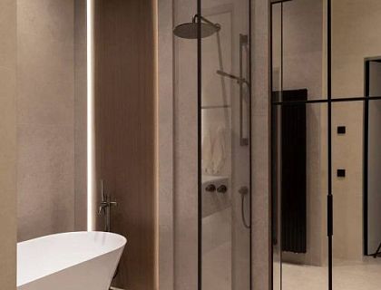 Зона отдыха расположена в уединенном уголке участка и окружена пышной зеленью со всех сторон. Спа комплекс состоит из двух объемов — объем комнаты отдыха с кухней и объем спа-зоны с парной. Все зоны имеют раздвижное панорамное остекление для максимальной интеграции в природу и расслабления. Особой изюминкой является дровяная парная с панорамным окном и видом на сад. Объемы объединены между собой общей террасой и перголой.
