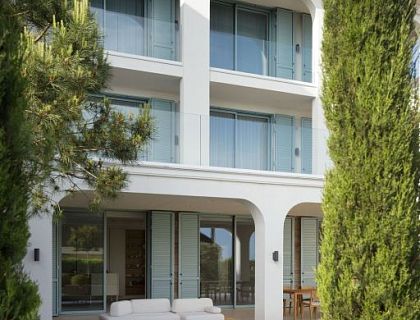 Проект выполнен в стиле шале с современной стилизацией в минималистичных и лаконичных формах, это создает гармонию с горным пейзажем. Здание выглядит очень стильно и современно, благодаря применению новых технологичных материалов: hpl-панелей с фактурой дерева, декоративной камешковой штукатурке и облицовочным колотым камнем, что создает гармоничную связь с окружающим горным ландшафтом.
