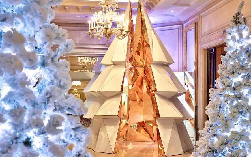 Рождественское дерево в отеле «Париж» в Монте-Карло, созданное при участии ювелиров известной мировой компании, украшено тончайшим сусальным золотом.