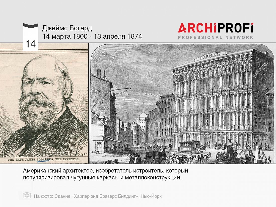 Джеймс Богард - американский архитектор, изобретатель и строитель, который популяризировал чугунные каркасы и металлоконструкции.