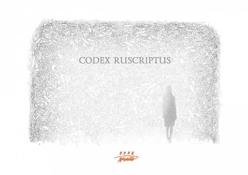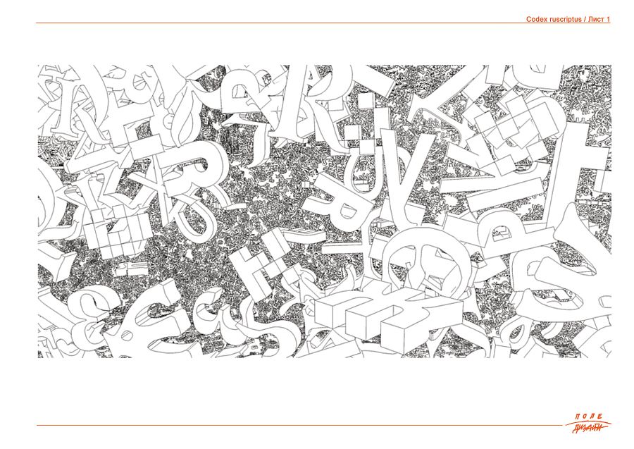 Безусловно идентичное, абсолютно формальное, отличное от привычной взгляду зрителя латиницы, лишенное «смысла» и содержания текста – оставленное в перцептуальной связи «свободной» композиции – сочетание букв из разных эпох, шрифтов, текстов. Композиция из разномасштабных букв, собранная в пространственную инсталляцию, создающую эффект «погружения» в бесконечность начертания знаков – в силуэты, в сочетания, в слои – в средовой «палимпсест».