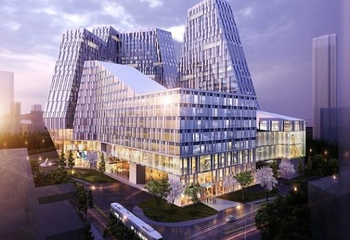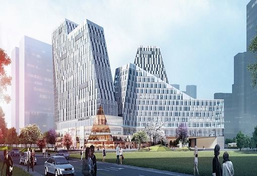 Калифорнийские архитекторы 5+design закончили проектирование комплекса «Алмазная гора» для Шэньяна (КНР). В процессе работы сложности вызвали строгие требования к инсоляции помещений. Вдохновение архитекторы черпали в традиционной пейзажной живописи Китая. Символическая «горная цепь» объединена с «высокогорным озером» атриума. Структура фасадов отображает слои осадочных пород.