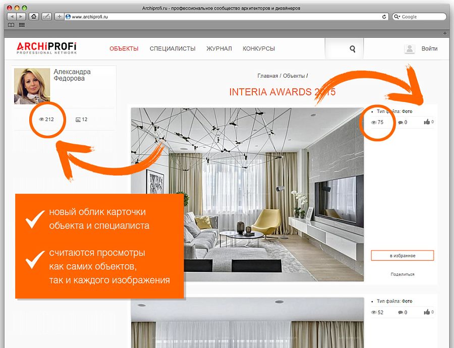 - На обновленном ресурсе в профилях пользователей будут отражены их профессиональные награды. Победители конкурса Interia Awards получат соответствующие значки. В ближайшее время такие же знаки отличия появятся у лауреатов конкурсов на портале «Звезда дизайна», конкурсов «Русский дизайн» и «Дом для звезды».