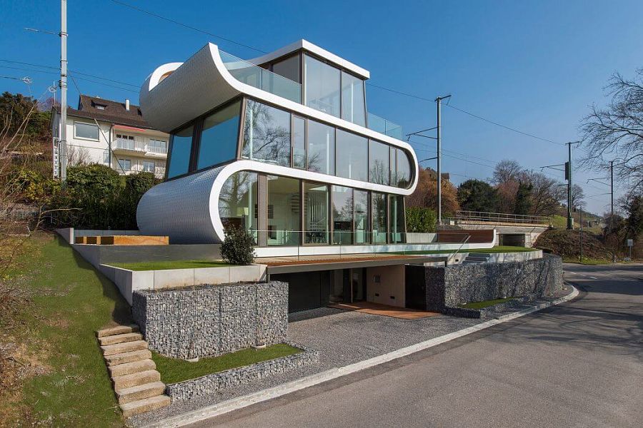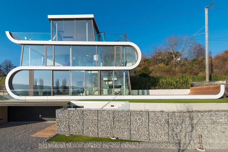 В Швейцарии появилось оригинальное строение – дом Flexhouse в виде объемной ленты. Фасад динамично изгибается, формируя три этажа с панорамным остеклением. Дизайн экстерьера и интерьера отличает визуальная «текучесть». Большая площадь остекления обеспечивает инсоляцию. Неординарный подход к дизайну архитекторов Evolution Design позволил создать полноценный туристический ориентир близ живописного озера.