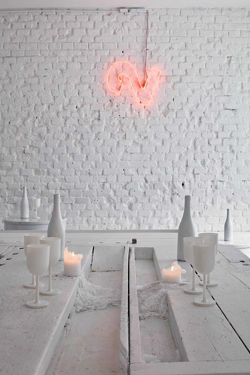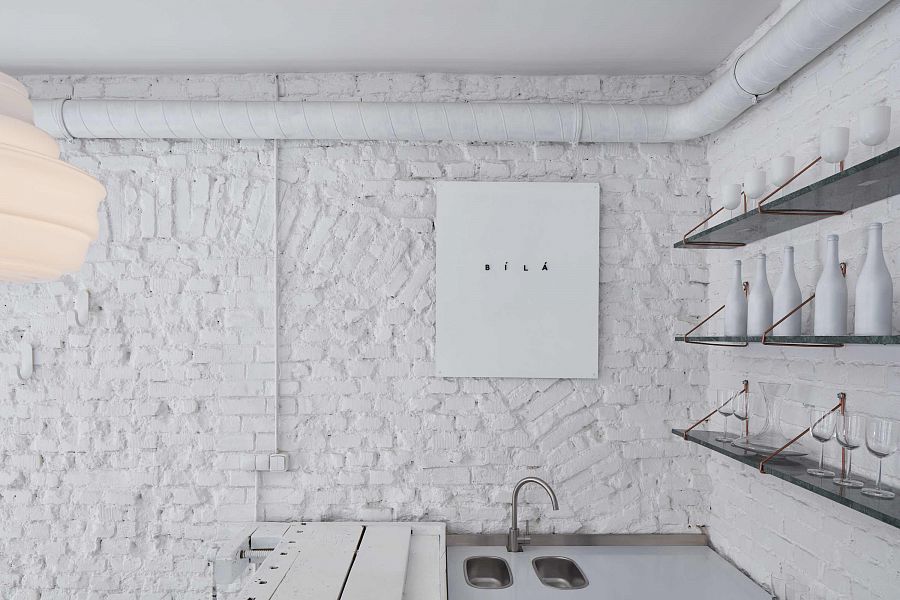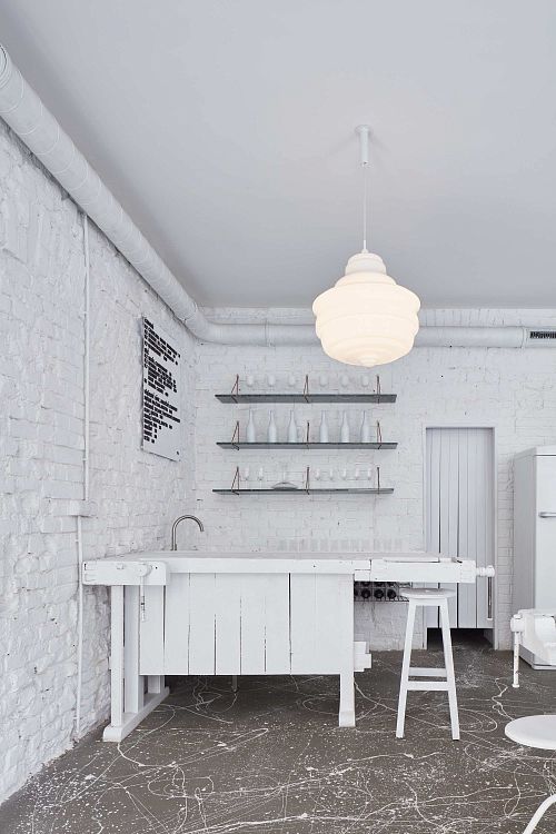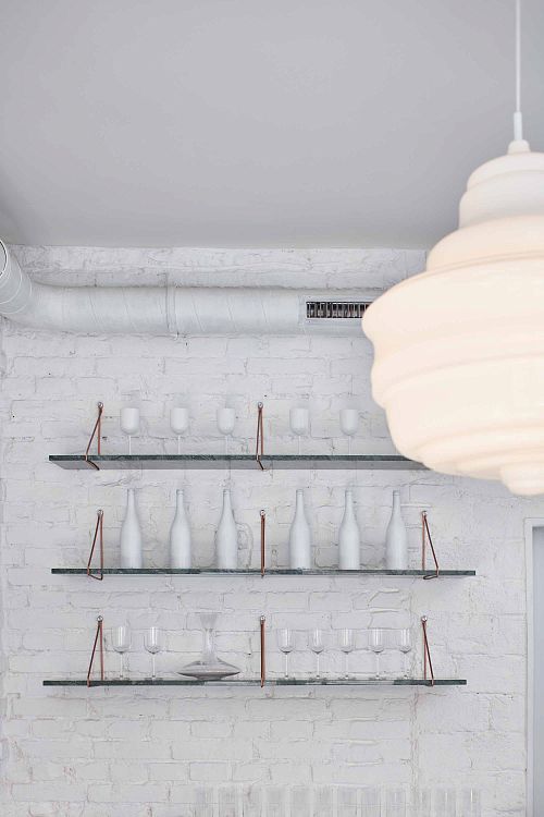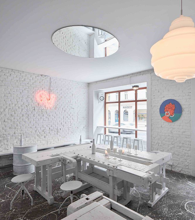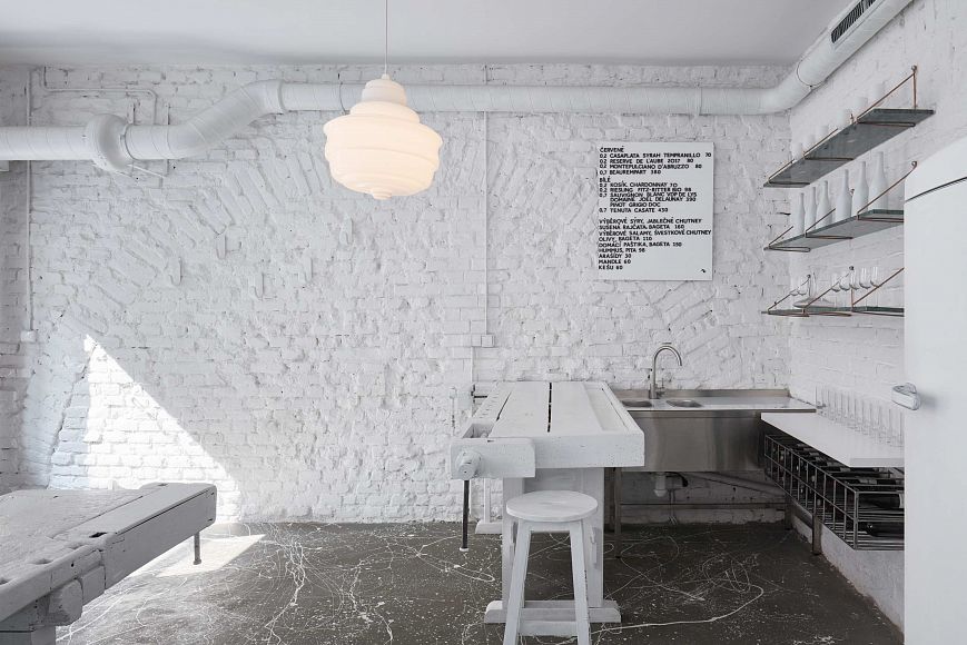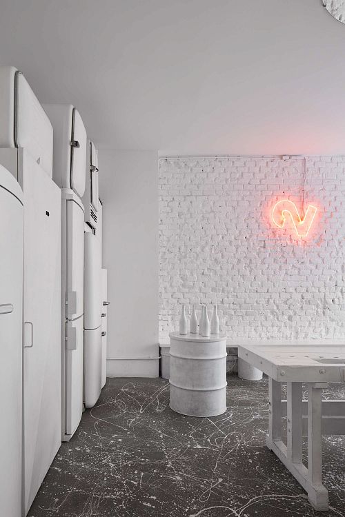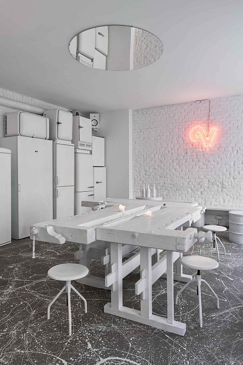 Вместо столов архитекторы использовали старые деревянные верстаки. Кроме этих «заслуженных» предметов в баре присутствуют холодильники разного размера, которые используются по назначению — для охлаждения вина. Круглые винтовые табуреты заменяют привычные барные стулья. Интерьер целиком выдержан в белом цвете. Даже рельефные кирпичные стены, полы, оставленные на виду трубы и колонки акустической стереосистемы окрашены белым. На этом «стерильном» фоне ярким пятном выделяется неоновый логотип винного бара. В качестве приставного столика, декорированного винными бутылками, авторы выбрали железную бочку. Еще одна примечательная деталь — круглое зеркало, закрепленное на потолке прямо над столами-верстаками.
