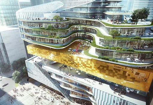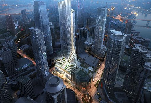Новая башня (Chongqing Xinhua Bookstore Group Jiefangbei Book City Mixed-use Project) в городе Чунцин (КНР) будет напоминать разматывающийся свиток. Форма не случайна, ведь именно она отражает суть древнекитайской мудрости - «знание приносит богатство». Проектировщики из бюро Aedas создадут несколько уровней террас, обнажающих интерьер здания. Завершить комплекс площадью почти 154 тыс. кв.м предполагается в 2020.