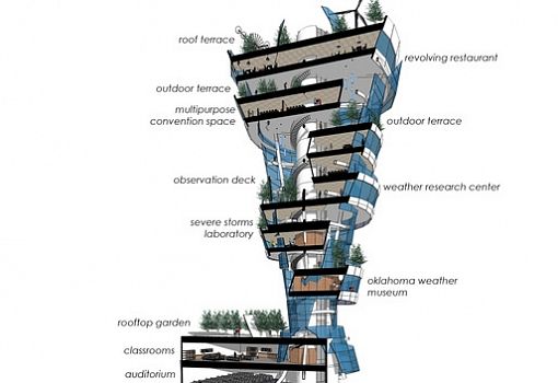Бюро KKT architects предложило изменить урбанистический облик города Талсы (Оклахома). По словам архитекторов, на месте старого склада площадью 8500 кв.м. можно построить тематическую башню в форме воронки торнадо. Погодные явления этого рода не редкость в регионе; сооружение высотой в 90 м могло бы стать центром по исследованию и прогнозированию торнадо. Подразумевается и общественная составляющая в виде музея, наблюдательных площадок и кафе на высоте 60 м с потрясающим видом на город. Для создания динамичного образа сооружения архитекторы предлагают обшить фасад перфорированными панелями и встроить светодиодные системы. Сложности вызывает только один вопрос: сможет ли башня противостоять настоящему торнадо?