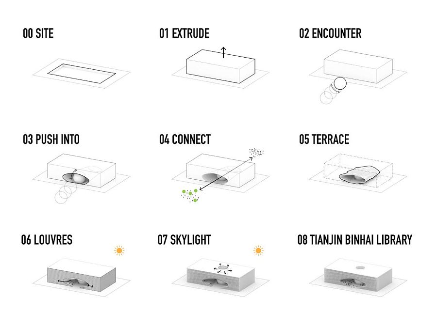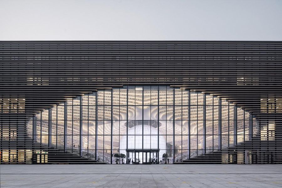 Необходимо отметить, что библиотека Биньхай - часть так называемого "культурного кластера", состоящего из пяти зданий, построенных разными архитекторами - Bernard Tschumi Architects, Bing Thom Architects, HH Design и теми же MVRDV. Все эти пять корпусов связаны между собой частично остекленной эспланадой, созданной по проекту студии GMP.